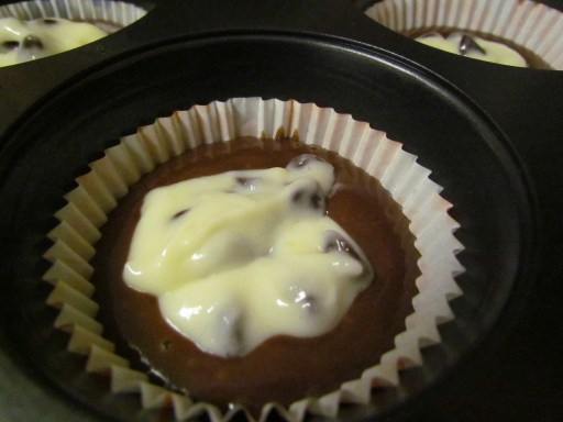 4. fill each baking cup 2/3 full with the cake batter and top with 1-2 tbsp of the cream cheese mixture.