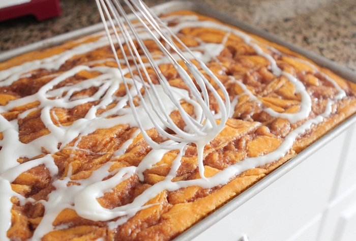 3. place butter into a microwave safe bowl and melt, about 30 seconds. add brown sugar and cinnamon to bowl, mixing until combined. drizzle mixture evenly over the cake, then take a knife and run it through to swirl.
