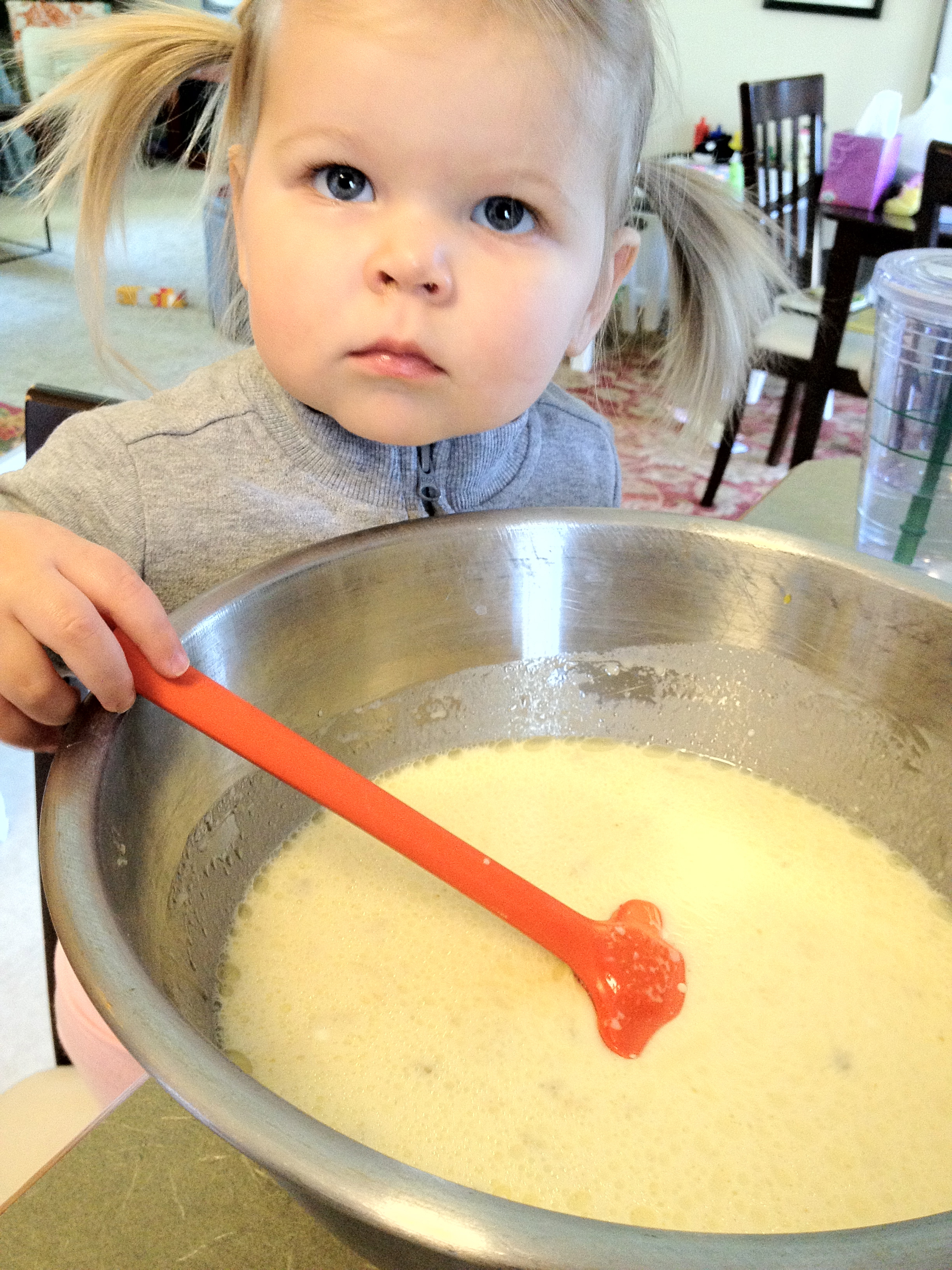 there isn’t always time to make them on weekdays and we’ve kind of made it a saturday morning tradition around our house. this morning was the first time the little she helped me make them. i pulled up a chair for her to stand on and she helped me mash the bananas and stir the batter. i have now hopefully started her own little obsession with The Spatula. just like mommy.