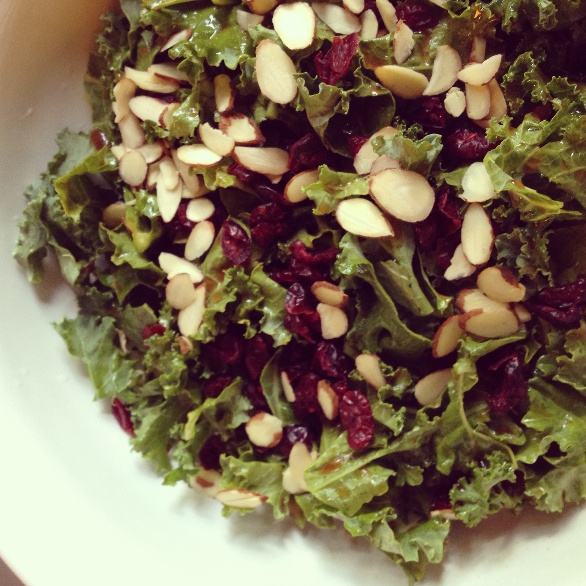 2. in a mason jar, combine orange juice, rice wine vinegar, soy sauce, sesame oil, agave, and ground ginger and give it a good shake (or you can whisk it all together in a small bowl). pour dressing over kale greens, add cranberries, and toss a bit.